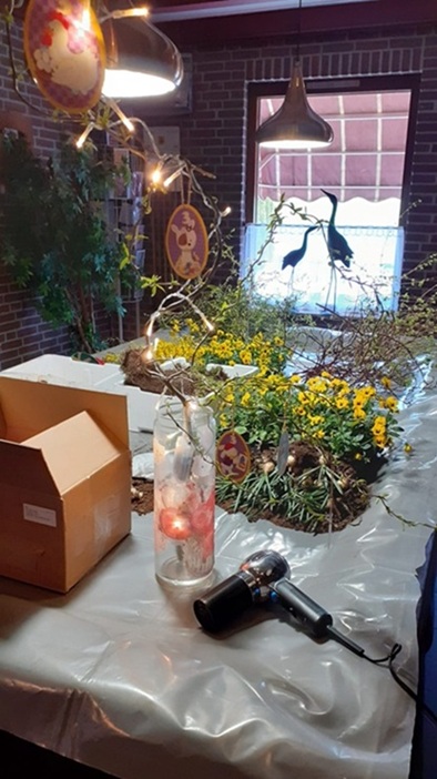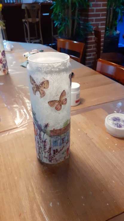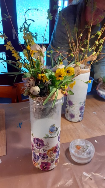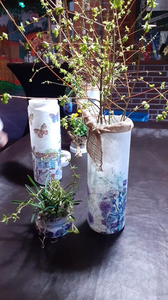 Op 28 maart vond het Crea Café weer plaats. Dit keer zijn er glazen potten versierd met afbeeldingen van servetten en zijn er bloemstukjes gemaakt voor in de vazen/potten.