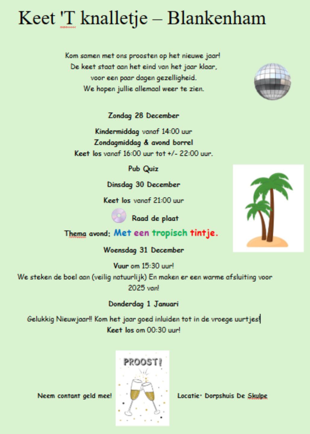 Het jaar is alweer bijna voorbij, en dat betekent maar één ding: de keet komt weer in het dorp voor oud en nieuw! 🎉 Tijd om samen terug te blikken op een mooi jaar, het nieuwe in te luiden met goede muziek, gezelligheid en natuurlijk een drankje. We maken er weer een machtig feest van🥳 Zie hieronder het volledige programma.
